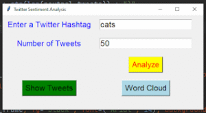 hashtag_label = Label(window, text=”Enter a Twitter Hashtag”, fg=”blue”, font=(“Arial”, 16))
